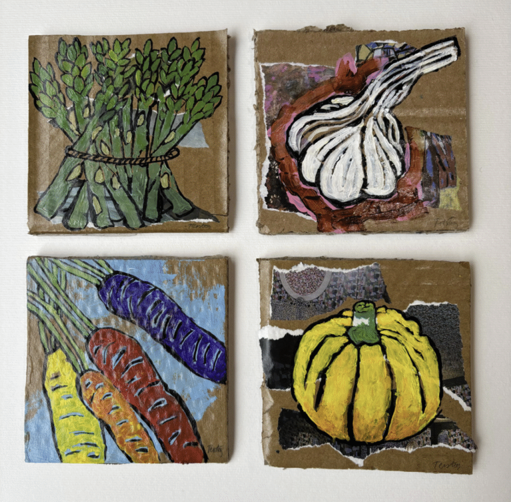 kartons van 10 bij 10 cm. De daarop geschilderde groenten springen in ’t oog, voor wie